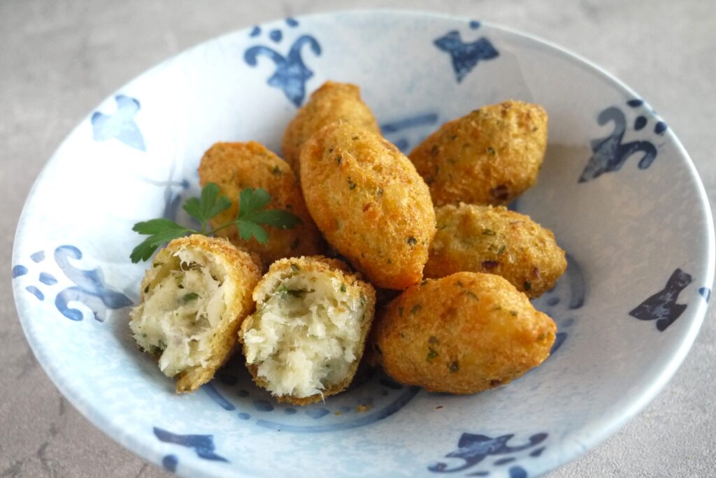パスティス・デ・バカリャウは、塩漬け干しタラ(バカリャウ)とじゃがいもを練り合わせ、パセリで香りを添えてカリっと揚げたコロッケです。