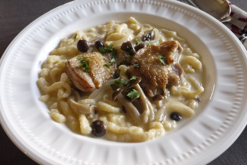 もっちりとしたドイツ風生パスタに、香ばしくソテーした鶏肉ときのこを合わせ、クリーミーなソースで仕上げます。