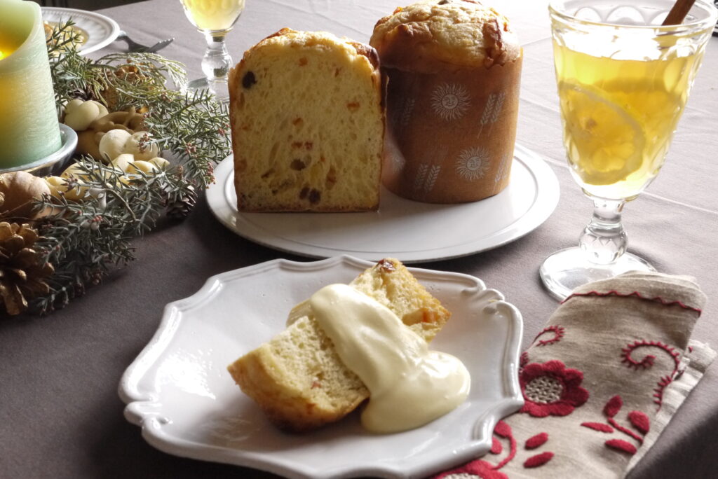 パネトーネの試食には、濃厚でなめらかなマスカルポーネソースを添えてお楽しみいただきます。